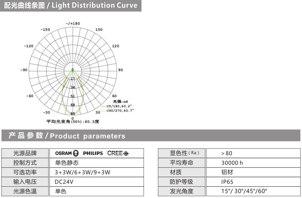 配光: 1、透镜采用日本帝人光学级PC原料,高精度的模具加工工艺,光斑均匀度>0.92 ,眩光值UGR<8 ,光斑完美,透光率同比高10%以上。