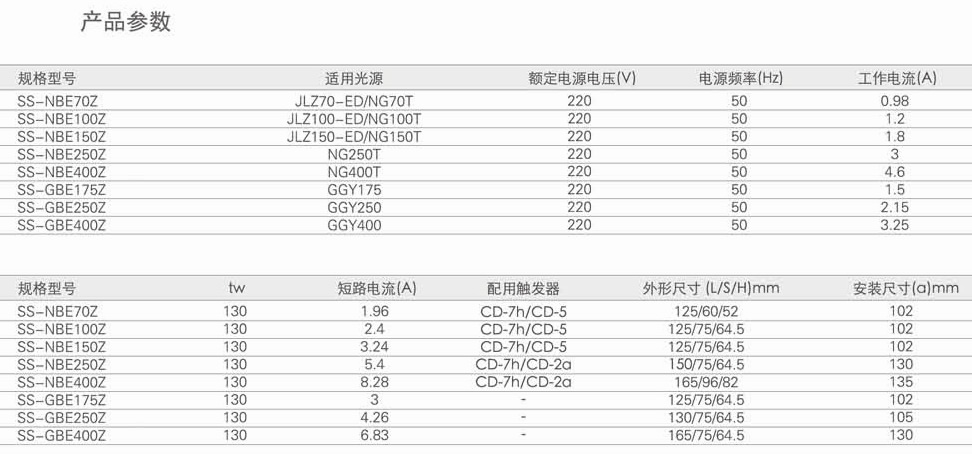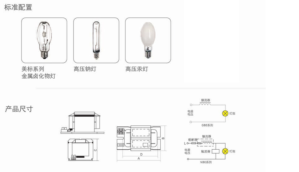 ●NBE系列用于高压钠灯配套使用,同时可以配套小功率金卤灯使用GBE系列用于高压汞灯配套使用。起到点灯电线路中稳定灯泡工作电流的作用