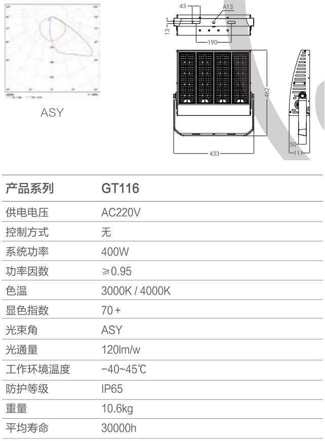 纯铝锻压高导热散热器,表面阳极化处;品牌LED灯珠,高亮度L ED,整灯光效1201m/W;亚明自制高性能恒流驱动电源; 防眩光蜂窝罩( 选配) ;K抗UV线PC透镜;螺丝采用不锈钢304材质,配有防坠落钢丝绳。