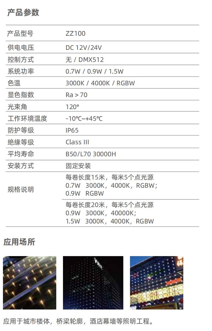 ●内置LED光源,可根据需要发出不同的颜色,还可以内置微电脑芯片,通过编程控制,实现七彩渐变、跳变、扫描、流水等全彩效果;也可以通过多个点光源像素点的阵列、造型组合来代替一定规格的显示屏,可变化出各种图案、文字和动画、视频效果;点光源是线性光源及泛光照明的一个补充。