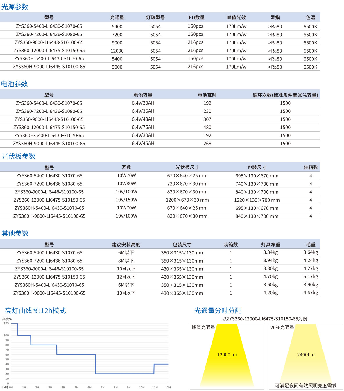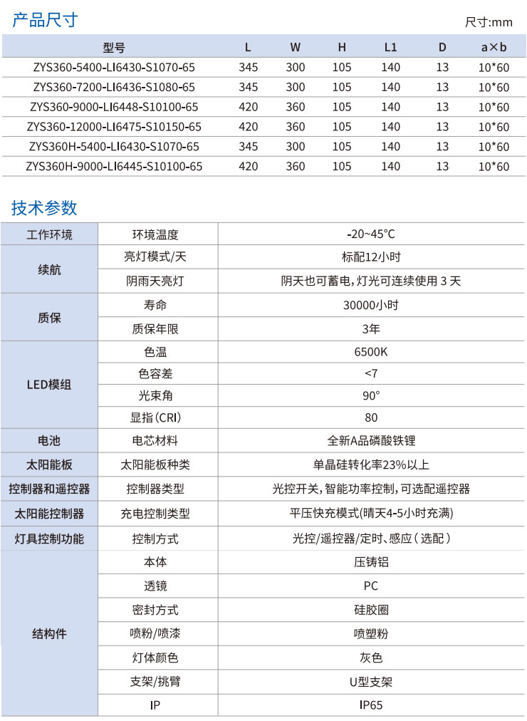 灯具内置全新磷酸铁锂电池,配备独立太阳能电池板、遥控器和安装配件。