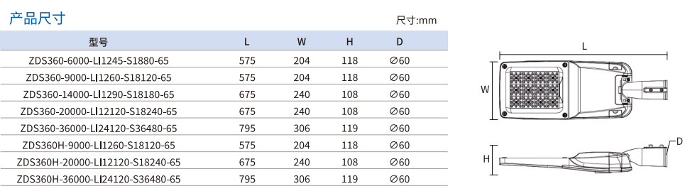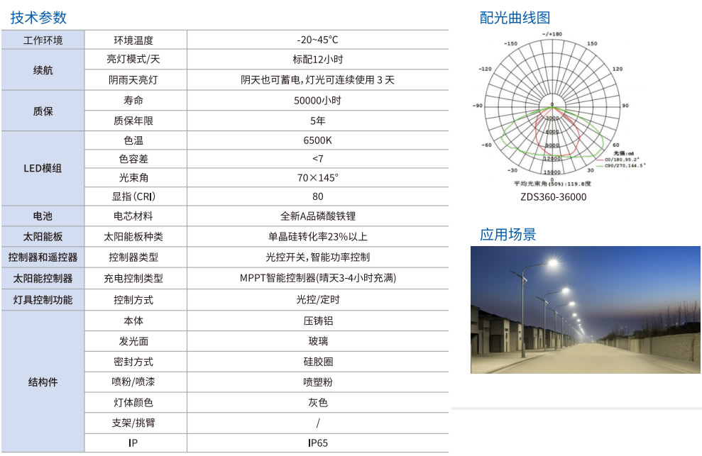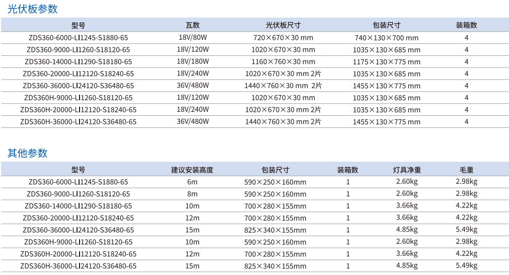 有离网和混合类型可供选择,产品名称中带有H表示可以连接交流电的混合版本。安装时只需将灯具固定在灯柱上,让发光面精准朝向待照明的路面,同时将太阳能板对准太阳即可。五种流明选项-6000、9000、14000、20000、36000流明